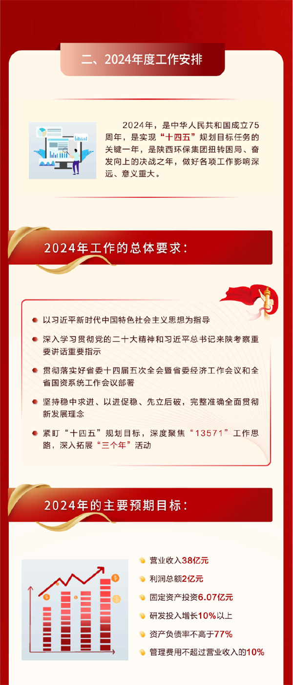 ±¨¸æ´Ó¡°¶¥²ãÉè¼Æ¡¢Êг¡ÍØÕ¹¡¢ÏîÄ¿½¨Éè¡¢¹úÆóˢС¢¿Æ¼¼Á¢Òì¡¢ÄÚ²¿¹Ü¿Ø¡±Áù¸ö·½ÃæÖÜÈ«×ܽá2023ÄêËêÇéЧ¹û£¬¿Í¹ÛÆÊÎöÁËÄ¿½ñ±£´æµÄÎÊÌ⣬²¢Ìá³ö2024ÄêËêÇéÖØµã£º¼á³ÖÎÈÖÐÇó½ø¡¢ÒÔ½ø´ÙÎÈ¡¢ÏÈÁ¢ºóÆÆµÄÊÂÇéµ¼Ïò£¬Éî¶È¾Û½¹¡°13571¡±Éú³¤Ë¼Ð÷£¬Íƶ¯¼¯ÍÅÔöÇ¿½¹µã¹¦Ð§¡¢Ìá¸ß½¹µã¾ºÕùÁ¦£¬¼ÓËÙ½¨³Éº£ÄÚÒ»Á÷ÓÀÓ¯»á¹ÙÍøÆóÒµ£¬Îª¸ÄÉÆÇøÓòÉú̬ÇéÐΡ¢ÖúÍÆÓÀÓ¯»á¹ÙÍø¹¤ÒµÉú³¤¡¢Æ×дÖйúʽÏÖ´ú»¯½¨ÉèµÄÉÂÎ÷ÐÂÆªÕÂ×÷³ö¸ü´óТ˳¡£2024ÄêÖ÷Ҫı»®Ä¿µÄÊÇ£ºÕûÄêʵÏÖÓªÒµÊÕÈë38ÒÚÔª£¬ÀûÈó×ܶî2ÒÚÔª£¬Àο¿×ʲúͶ×Ê6.07ÒÚÔª£¬Ñз¢Í¶ÈëÔöÌí10%ÒÔÉÏ£¬×ʲúÇ·Õ®Âʲ»¸ßÓÚ77%£¬ÖÎÀíÓöȲ»Áè¼ÝÓªÒµÊÕÈëµÄ10%¡£